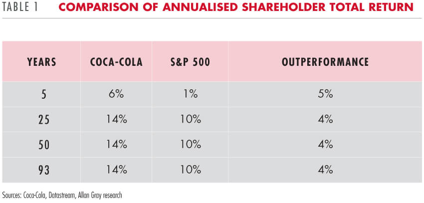 One company that fits the profile is Coca-Cola. The company has been around for 126 years and has faced capitalism's creative destruction for long enough to be counted as a fair example. Table 1 illustrates how Coca-Cola has been able to generate value for shareholders over the short, medium and long term beyond the market average. If an investment in the market in 1919 was worth R1m today, an equal investment in Coca-Cola would be worth R37m.