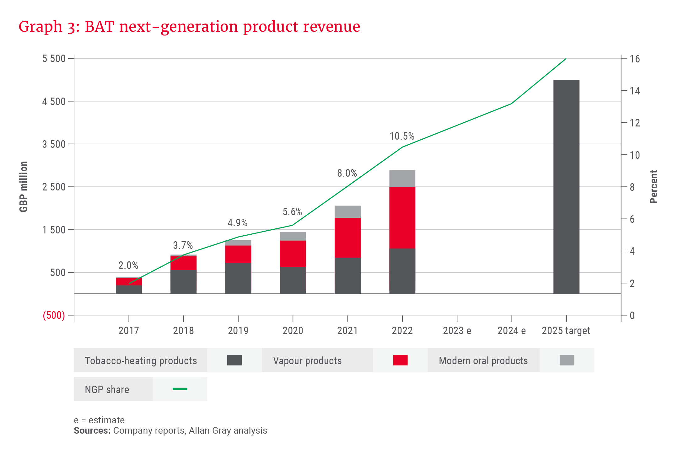 BAT is currently targeting GBP5bn NGP revenue by 2025, as shown in Graph 3, and break-even by 2024, with 50 million NGP consumers by 2030. Further out, they expect at least 50% of group revenues to come from NGPs by 2050. This won’t be easy, as the overall industry also sees the benefits of these new products: