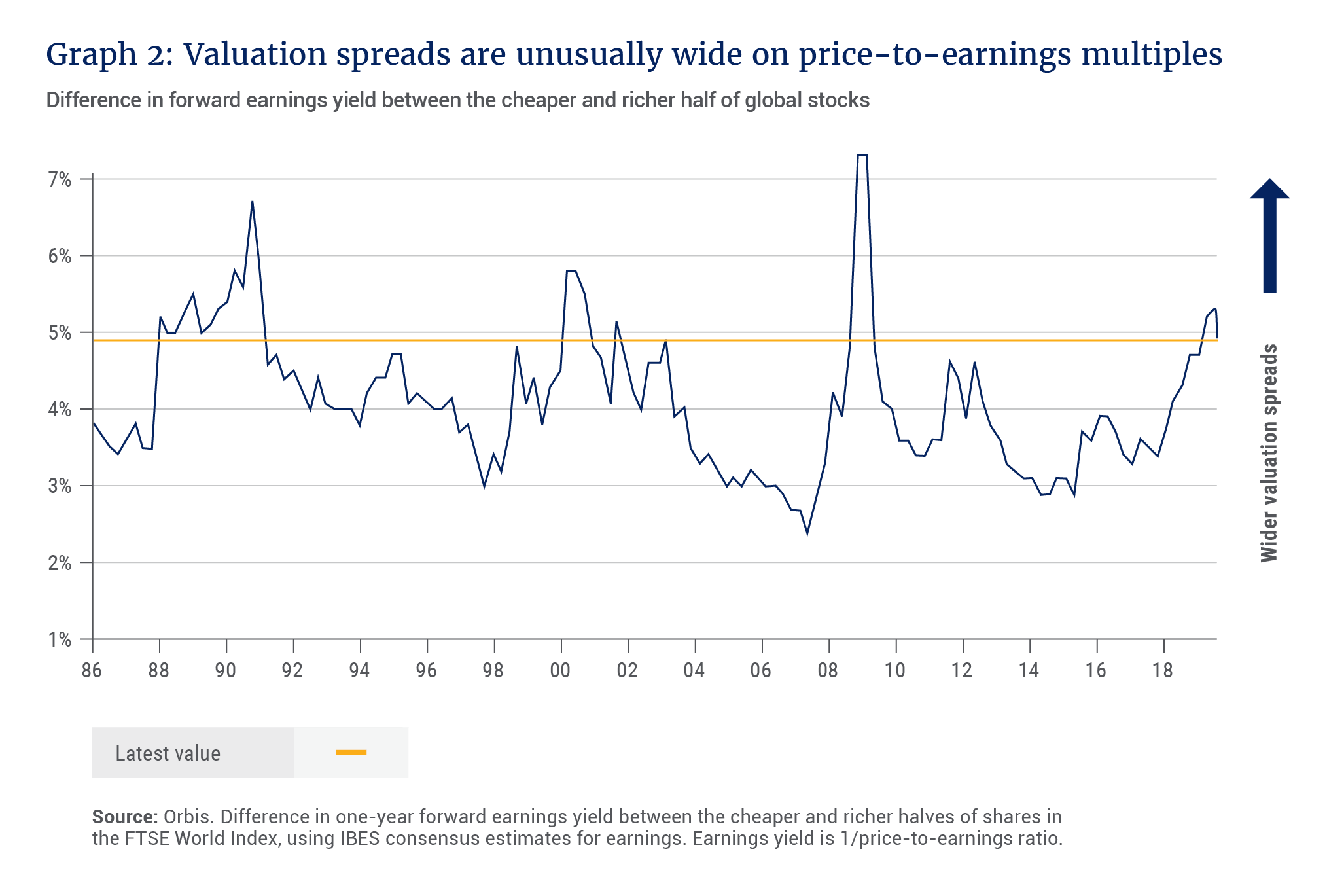 Finally, if awareness of value investing closed all the discounts in the market, you would expect to see muted differences between the valuations of cheap and expensive companies. Yet valuation spreads today are unusually wide. That’s true whether you look at the classic price-to-book multiple, or at other measures such as price-to-earnings (see Graph 2). Over the past 30+ years, the valuation gap below has only been wider around the Japan bubble in 1990, the tech bubble in 2000, and at the trough of the global financial crisis. On each of those occasions, the “value investing is dead” refrain was heard far and wide.
