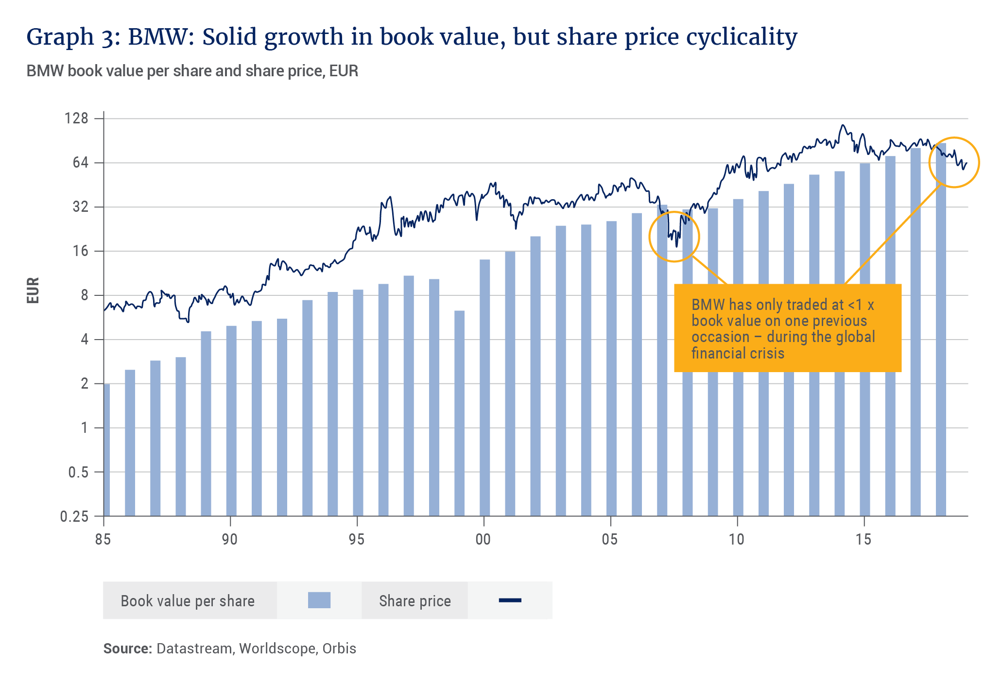 Yet due to industry pessimism, BMW today trades at just 0.8 times book value and six times depressed 2018 earnings, compared to 2.4 times and 21 times for the wider European market (see Graph 3). In any other sector, a luxury brand with a century-long pedigree and peer-leading financial returns would likely trade at a premium to the market. We believe a rerating to just 1.1 times book value, coupled with modest growth and a well-covered 5.5% dividend yield, could drive very attractive returns for BMW shares over our investment horizon.