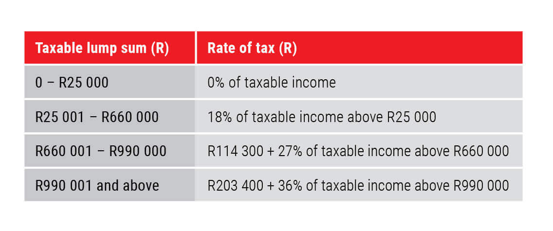 The first R25 000 of a pre-retirement lump sum withdrawal remains tax-free. The table below illustrates how withdrawal lump sums will be taxed: